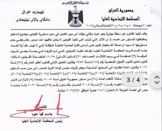 بالوثيقة :المحكمة الاتحادية تقرر ايقاف العمل بقوانين العفو العام والأحوال الشخصية والعقارات