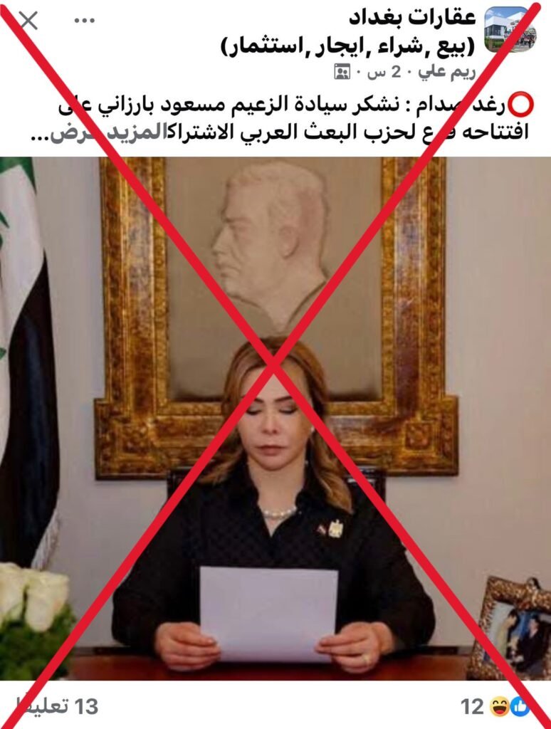 خبر مزيف..عابر تتحقق من صحة خبر مباركة رغد صدام لافتتاح مقر لحزب البعث المحظور في اربيل