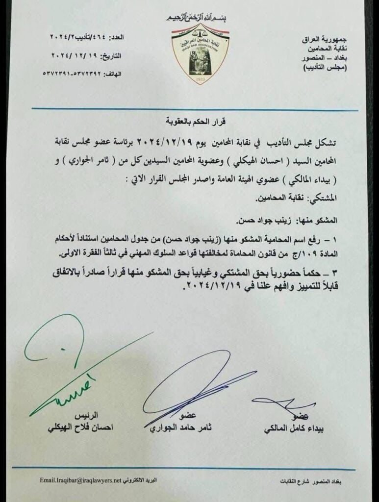 اثار قرار مجلس التأديب في نقابة المحاميين ، برفع اسم المحامية زينب جواد من جدول المحامين ، وذلك لمخالفتها قواعد السلوك المهني سخط ناشطين ومدافعين عن حقوق الانسان لما وصفوه بانه استهداف للمحامية جراء بروز اسمها في رفض قانون الاحوال الشخصية المعروض في البرلمان من قبل قوى واحزاب اسلامية .