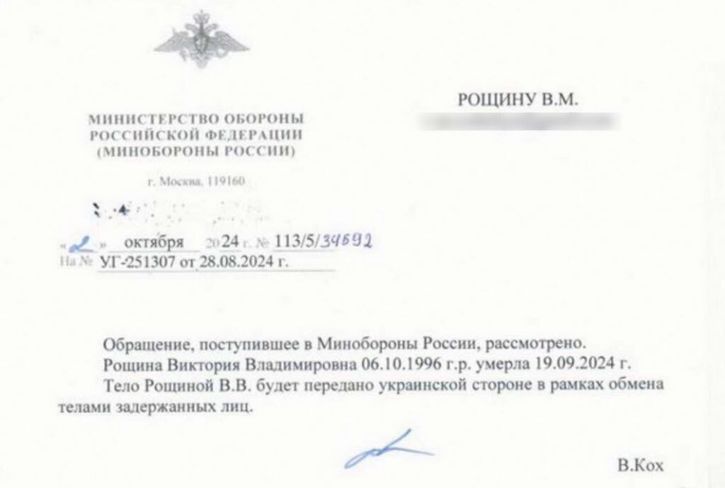 أعيدت جثة روشينا إلى أوكرانيا في شباط/فبراير 2025؛ وقد ظهرت على الجثة آثار تعذيب وأعيدت من دون بعض الأعضاء.