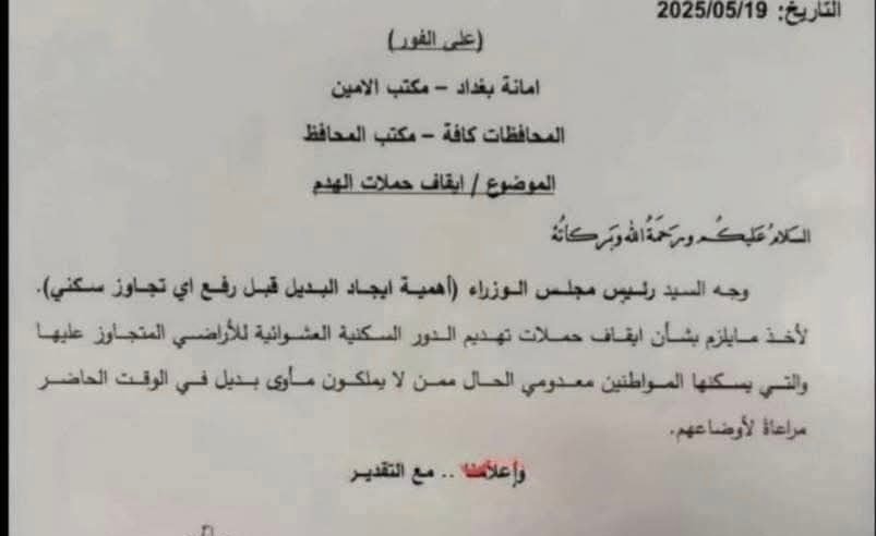 حصلت “عابر” على نسخة من التوجيه الرسمي، الذي برر فيه السوداني قراره بـ”مراعاة الوضع الإنساني للعائلات الفقيرة التي تقطن هذه البيوت”، مؤكدًا على أن الإجراءات يجب ألا تؤدي إلى تشريد المواطنين أو تعريضهم للخطر.