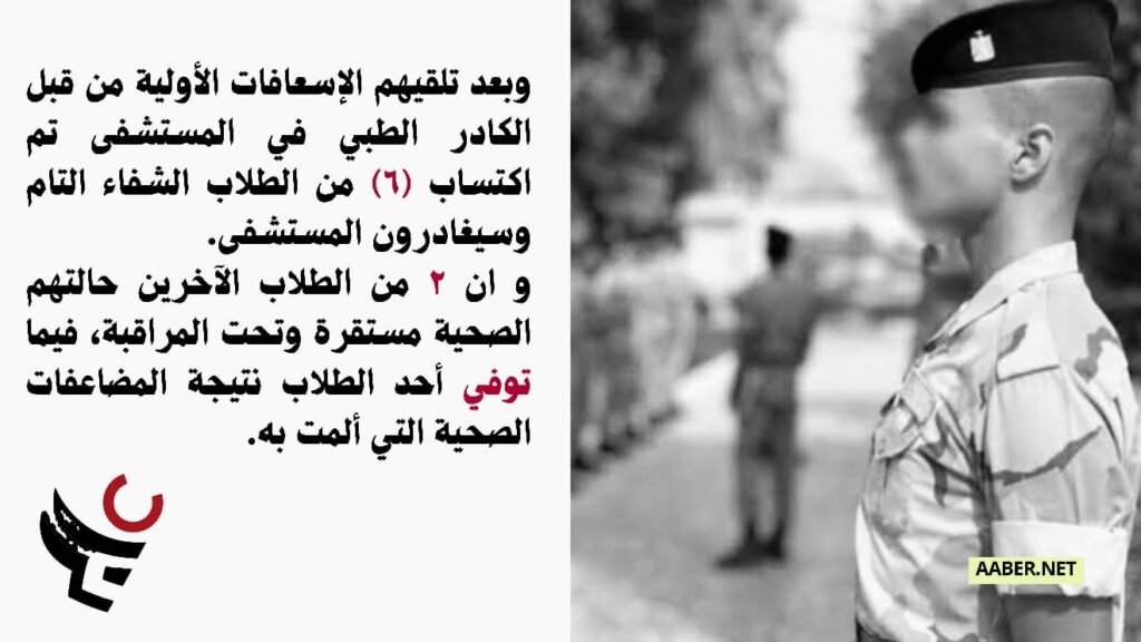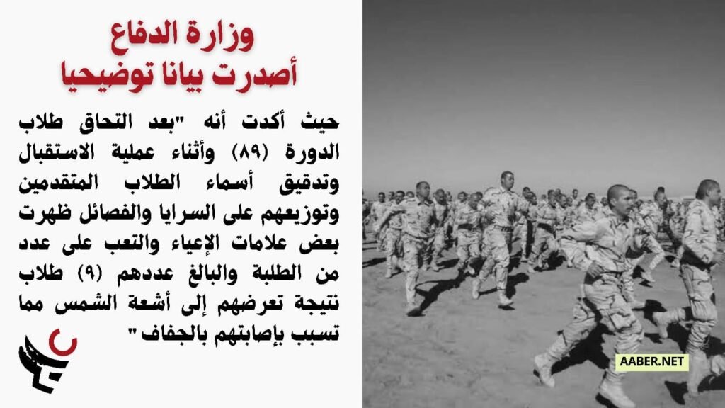 وكانت وزارة الدفاع قد أعلنت في وقت سابق اليوم وفاة أحد طلاب الدورة (89) وإصابة ثمانية آخرين، إثر تعرضهم لأشعة الشمس المباشرة خلال إجراءات الاستقبال والتوزيع على السرايا، في أجواء شديدة الحرارة.