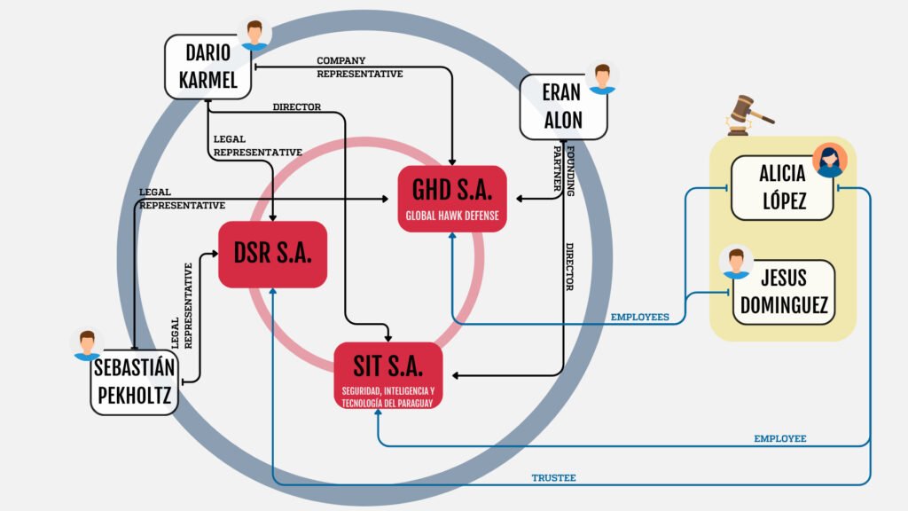 ويشغل أفراد آخرون مناصب متداخلة في الشركات الثلاث. على سبيل المثال، يرد اسم إيران ألون مديراً لشركة SIT Paraguay ويظهر بوصفه شريكاً مؤسساً لشركة GHD في الوثائق الرسمية للشركة. كما يظهر سيباستيان بيكولتز في مناصب قيادية مختلفة. وترتبط أليسيا لوبيز، التي تواجه حالياً تهم تهريب، بشركة GHD، وهي أيضاً موظفة في شركة SIT Paraguay ووصية على شركة DSR.