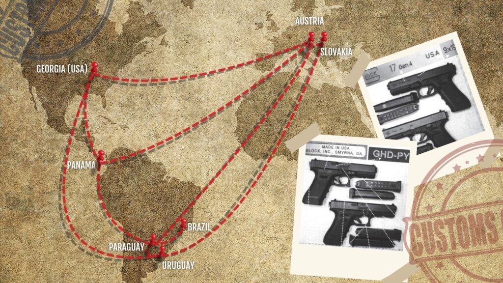 تكشف وثائق من الشرطة الفيدرالية البرازيلية، حصل عليها اتحاد فوربيد ستوريز، أن سلاحاً من طراز غلوك عيار 9 ملم صُنع في الولايات المتحدة تم استيراده إلى باراغواي عبر شركة SIT Paraguay (رمز المستورد SIT-PY)، ثم تم إزالة رقمه التسلسلي قبل ضبطه في البرازيل.