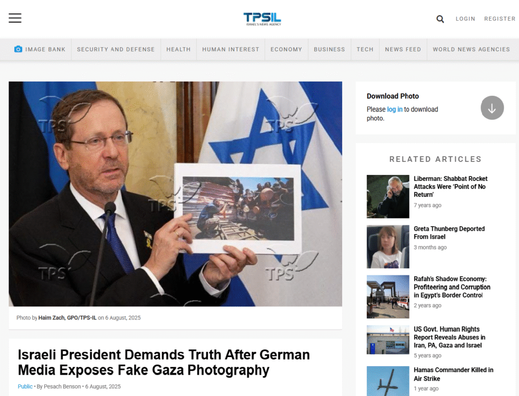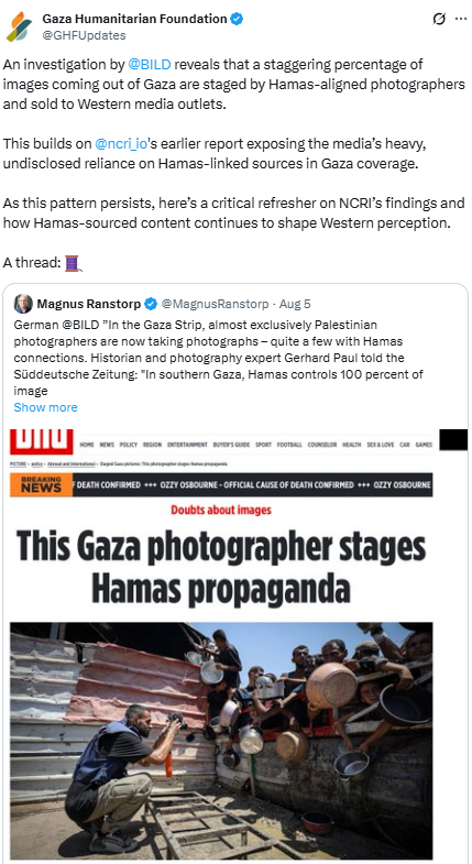 في 3 و5 آب/ أغسطس 2025، نشرت صحيفتا "زود دويتشه" و"بيلد" الألمانيتان تقارير زعمتا فيها أن حركة حماس تفبرك صور التجويع في قطاع غزة بهدف إثارة تعاطف الغرب وتأجيج الغضب ضد إسرائيل. في 6 آب/ أغسطس، أعادت "مؤسسة غزة الإنسانية" نشر ما وصفته بأنه "تحقيق" لصحيفة بيلد، زعمت فيه أن "نسبة كبيرة من الصور القادمة من غزة مفبركة من قبل مصورين مرتبطين بحماس وتُباع لوسائل إعلام غربية".