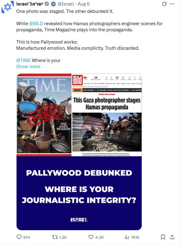 سرعان ما انخرطت حسابات رسمية إسرائيلية، من بينها الحساب الرسمي لإسرائيل ووزارة الخارجية الإسرائيلية، في إعادة نشر الادعاء على نطاق واسع. وقد زُعم أن الصورة التي تصدّرت غلاف مجلة تايم فبركها المصوّر الفلسطيني أنس فتيحة، رغم أن من التقطها فعليّاً هو المصوّر علي جاد الله. وأُدرجت الصورة مباشرة ضمن مصطلح "باليوود" (Pallywood)، في محاولة للترويج لرواية تزعم أن صور التجويع والقتل الصادرة من غزة مفبركة ومصطنعة.