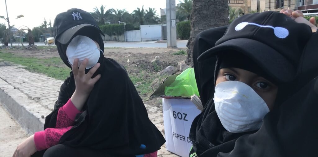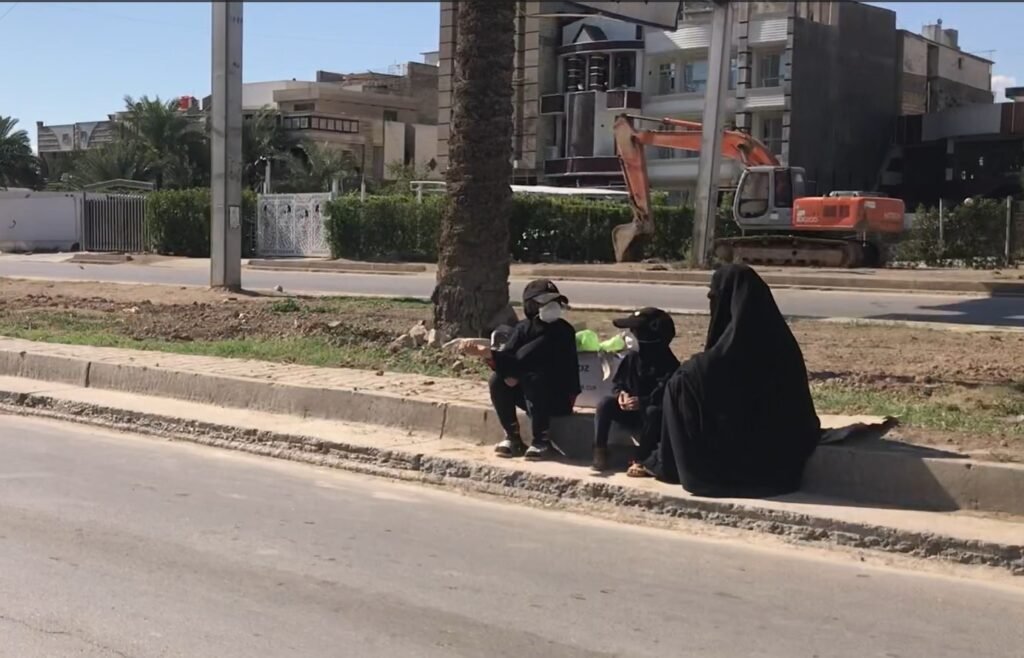 أم كرار وطفلتيها تتسول في شوارع بغداد، تقول إن زوجها توفي، ولم تجد سوى الرصيف للاستجداء وإعالة نفسها وطفلتيها.